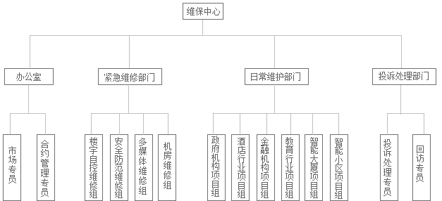 我们在各个系统层面均设有专门的维修组,共有楼宇自控维修组、安全方案维修组、多媒体维修组、机房维修组等四